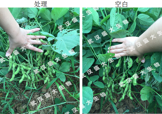 盛大生物研發部于5月27日在大豆上施用“螯合鐵”,改善作物鐵營養和促增產效果明顯。于大豆苗期進行“螯合鐵”的葉面噴施,2小袋/畝,噴施3次,間隔 7-10天,效果如下:1、大豆上葉面噴施“螯合鐵”后,大豆缺鐵癥狀得到緩解,新葉葉片顏色由黃綠色向綠色轉變(圖1)。說明對缺鐵大豆進行“螯合鐵” 葉面噴施后,可有效改善大豆缺鐵癥狀。2、大豆上葉面噴施三次“螯合鐵”后,大豆的莢果多、籽粒飽滿、葉片正常、無枯死葉片 ,產量得到明顯提高(圖2)。 3、調查數據顯示,“螯合鐵”處理20個莢果鮮重達到36.35g,比空白增產24.5%;20個莢果的籽粒鮮重達到19.68g,比空白處理增產 16.2%。