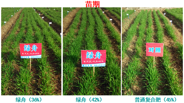 “綠舟”功能肥(小麥專用42%含量)、“綠舟”功能肥(小麥專用36%含量)及普通復合肥(45%含量)進行對比試驗。每畝(667平米)用肥量為“綠