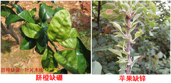 縱觀全國,在北方果園中,蘋果、梨和桃樹常出現缺鐵的黃葉病、缺鋅的小葉病和缺硼的腐心病,在南方果園里,柑橘、荔枝因缺硼或缺鋅所引發的落果和新梢黃化癥等近年來也常常出現(如下圖)。